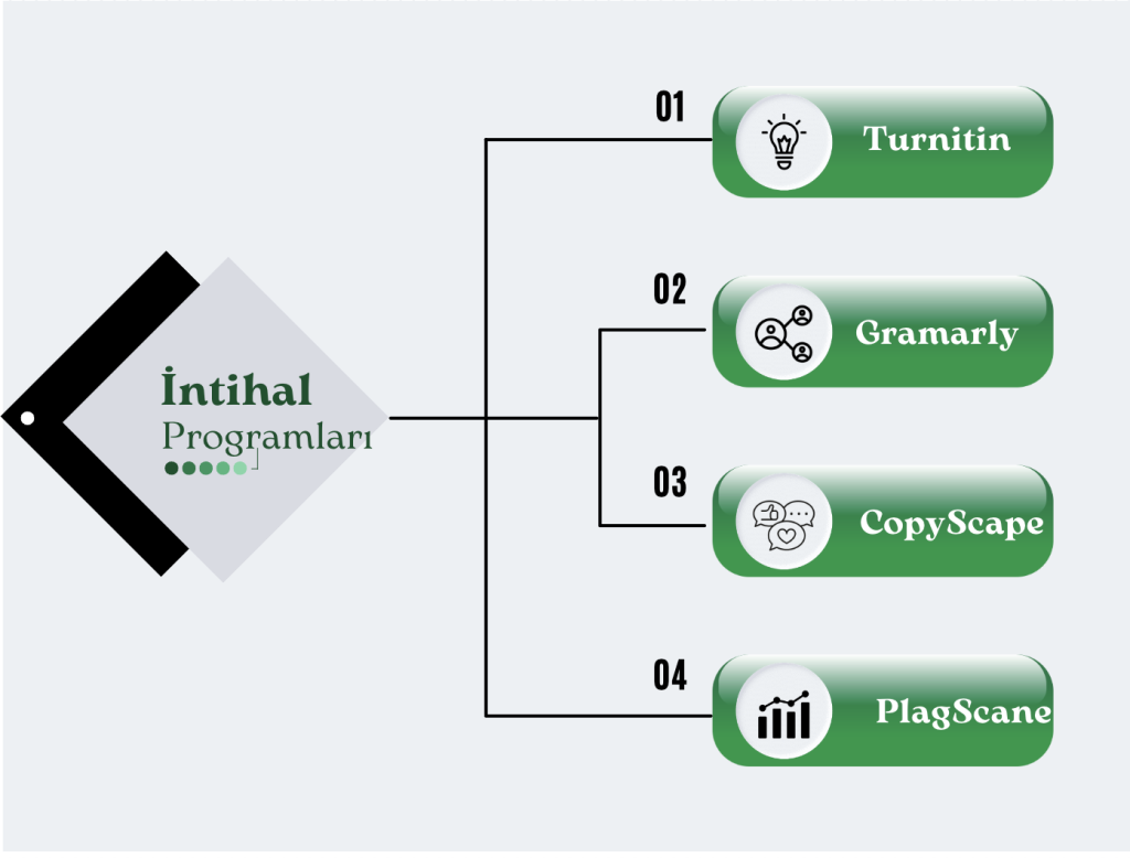 İntihal tespiti için genellikle kullanılan programlar Turnitin, Gramarly, CopyScape, PlagScane gibi araçlardır.
